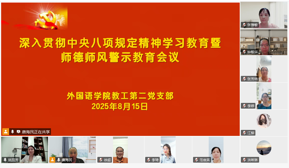 为持续开展深入贯彻中央八项规定精神学习教育,进一步强化师德师风建设,awc77万象城官网教工第二党支部于8月15日通过腾讯会议平台召开师德师风警示教育会议。会议由党支部书记唐海民主持,支部全体党员参加。
