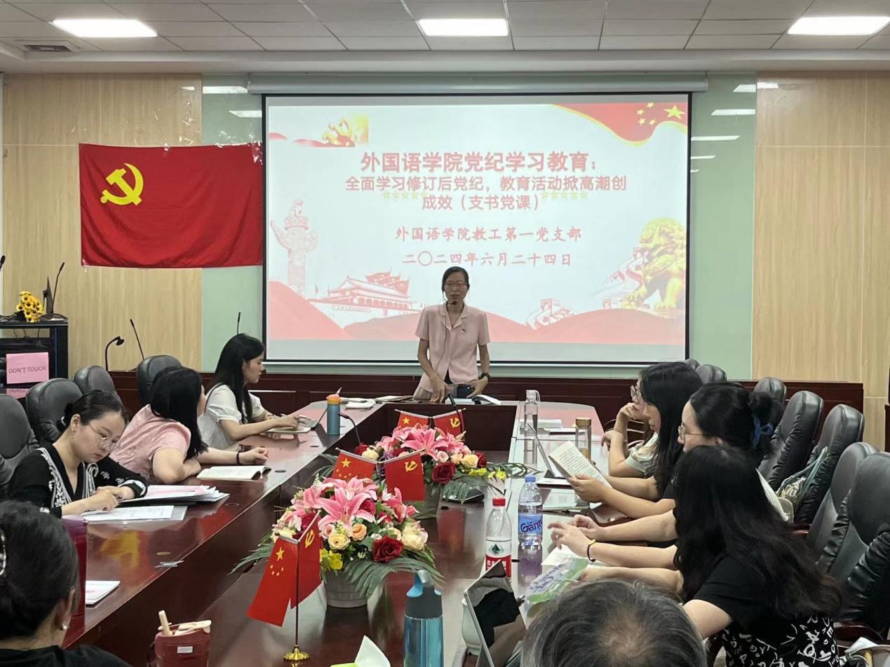 为进一步做好党纪学习教育工作,推动党纪学习教育走深走实,awc77万象城官网教工第一党支部于6月24日下午,在二政308会议室开展了党纪学习教育主题党课活动,党支部书记何瑞玉老师主讲。