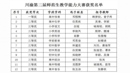 在近日落下帷幕的川渝第二届师范生教学能力大赛中,taptap白瑶、李晓凤、肖静、邓思佳四名同学经过长时间的备战和激烈角逐,凭借出色的表现和实力,斩获省赛三等奖佳绩。