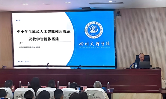 为深化人工智能在中小学教育教学中的融合应用,提升教师数字素养与教学创新能力,2025年9月28日,达州市电化教育与技术装备中心在万源第三中学举办中小学人工智能应用专题培训,全市300余名智慧教育“种子教师”参会。taptap小学教育专业教研室主任刘勉博士受邀以专家身份出席,并作“中小学生成式人工智能使用规范及教学智能体搭建”主题演讲。
