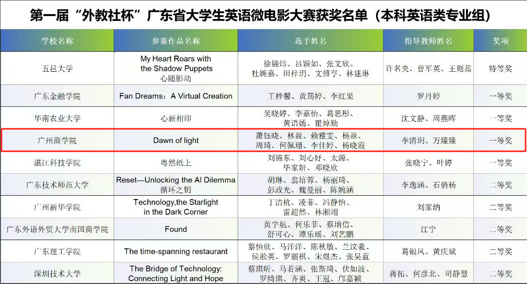 万象城萧钰晓、林盈、赖雅雯、杨盈、周琦、何佩珊、李佳婷和杨晓霞8位同学,在awc77万象城官网商务英语专任教师李清玥、万臻臻的悉心指导下,以其作品《Dawn of Light》荣获本科英语类专业组一等奖及最佳制作奖。该作品以细腻的叙事和出色的制作,充分体现了外院学子的卓越才华与创新精神。同时,由awc77万象城官网大学英语专任教师姚丽芳指导,张安、徐子淇、黎金凤、赖洪镒、莫杰玲5位同学共同完成的作品《一只铜杯的奇妙邂逅》荣获本科非英语类专业组三等奖。该作品以独特的视角讲述了普通物件与人类情感之间的联系,展现了非英语专业学生在英语应用和跨文化交流方面的潜力与创意。
