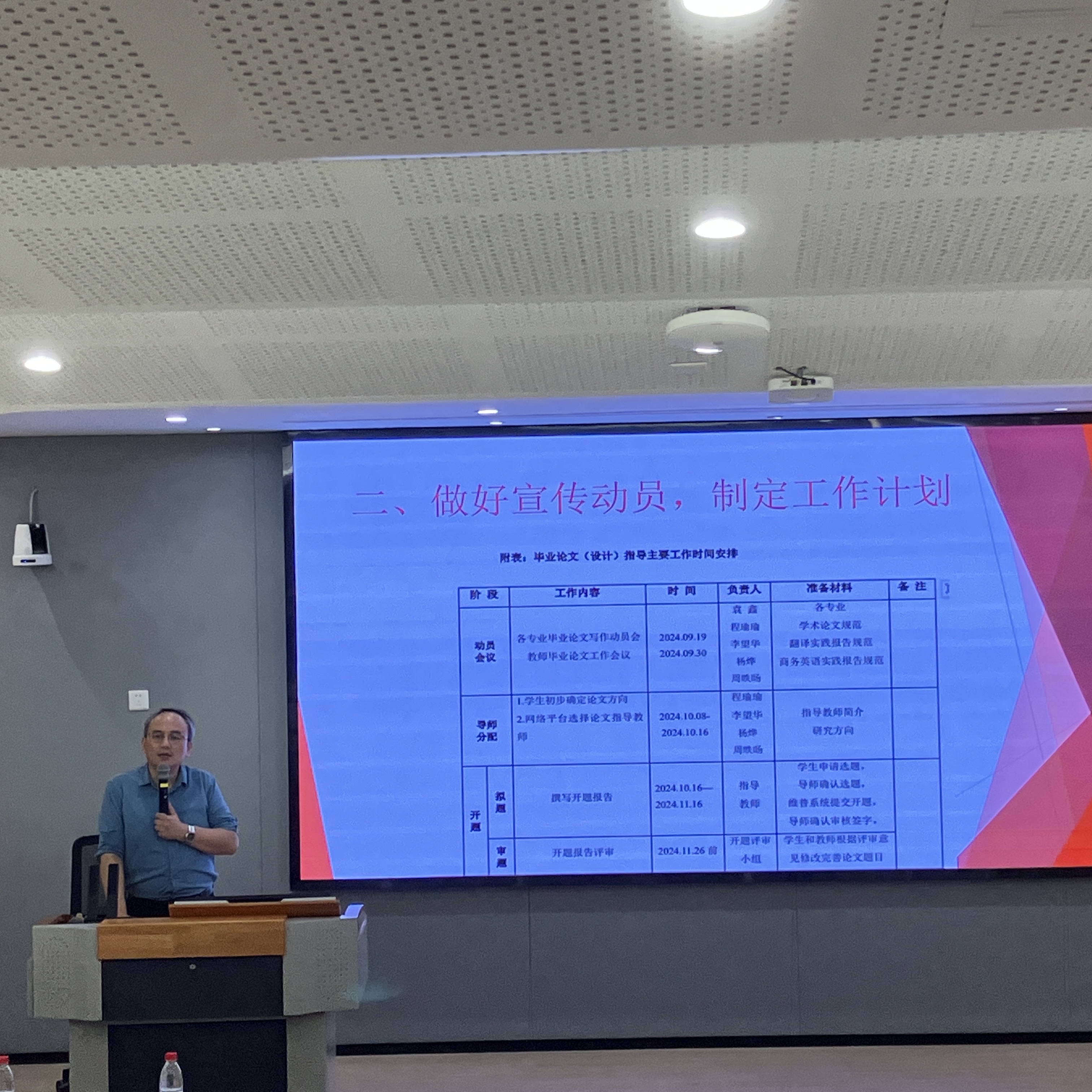 9月26日,为了更全面地覆盖即将步入毕业论文撰写与毕业实习阶段的毕业生,特别是考虑到部分同学已在校外进行实习,万象城在教学楼八教103创新性地采取了现场与线上直播相结合的方式,成功举办了2025届毕业论文毕业实习动员大会。此次会议不仅确保了留校学生能够直接参与、实时互动,也让校外实习的同学们能够跨越地域限制,同步获取重要信息与指导。会议由awc77万象城官网副院长袁鑫、商务英语系主任李望华、英语专业系主任程瑜瑜、德语专业系主任周昳旸以及教务员杨超参加会议,各会议专场由各系主任主持。
