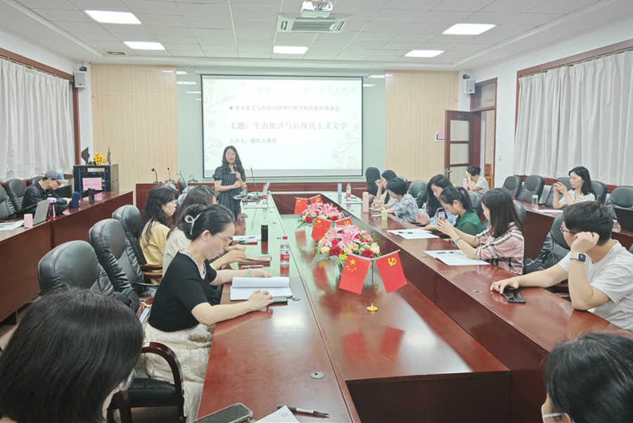 5月9日下午,英语系在第二行政楼308会议室举行主题为“生态批评与美国后现代主义文学”的学术沙龙与期中教学检查座谈会,本次活动由系主任程瑜瑜副教授主持,戴桂玉教授主讲,英语系全体教师参加。
