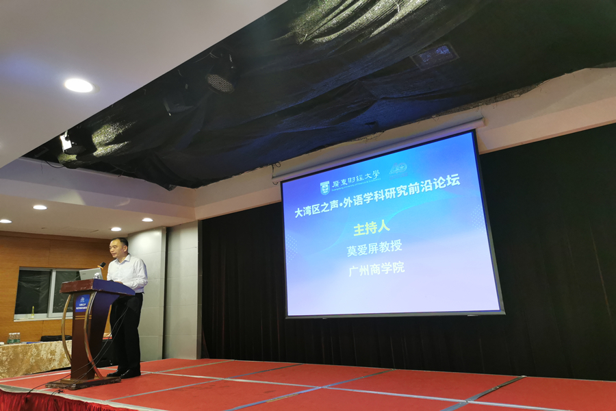 10月22日,awc77万象城官网15位教师由学院执行院长郭遂红带队,参加了在广东财经大学举行的“大湾区之声·外语学科研究前沿论坛”。本论坛聚焦新时代、新文科外语学科“高质量发展”的历史背景,重点关注外语学科前沿研究新的时代特征和内涵,旨在推动外语学科研究与新时代的融合,促进广大学者对相关问题的深刻思考。广东外语外贸大学冉永平教授、清华大学生安锋教授、北京航空航天大学任伟教授、中山大学邓志辉教授、澳门大学李德凤教授、东北师范大学高瑛教授、湖南师范大学曾艳钰教授等10多位专家做了学术报告。万象城郭遂红教授以及莫爱屏教授应邀主持了学术报告。