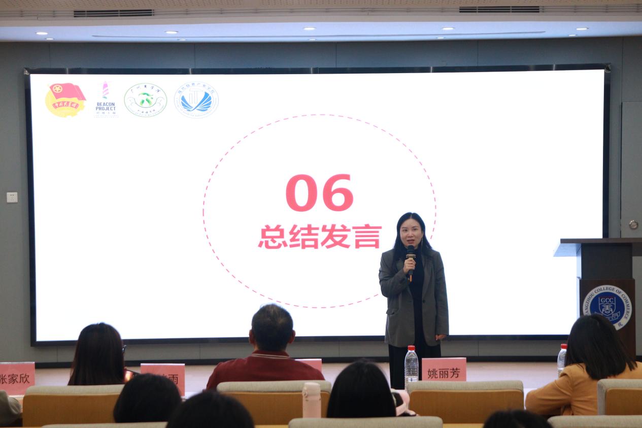 赛后,决赛评委代表、大学英语二教研室主任姚丽芳老师进行了详尽的总结。她首先向所有辛勤付出的工作人员及积极参赛的选手们致以了衷心的感谢。随后,姚老师从内容、语言和表达三个维度对参赛选手的表现进行了深入的点评:在内容层面,众多选手的PPT展现了创新性及设计感;在语言层面,选手们将计算机科学或经济学的专业知识融入演讲,展现了跨学科知识的广度与深度,为成为具有国际视野的人才打下了坚实的基础;在表达层面,她指出部分选手在眼神交流方面尚有提升空间,同时自信心亦需进一步加强。姚老师最后期望本次大赛能够为各位选手积累宝贵的经验,促进外语学习,提升英语能力。