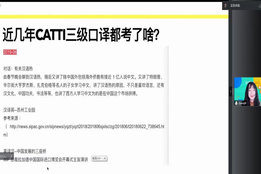 徐溱圻针对CATTI考试的两种类型、报考时间、考试的内容、目的以及基本要求,建议同学们在日常生活中应加强练习,巩固基础,多了解国家历史与文化,尊重中英差异,以更准确地翻译文章原意。她分析了近几年的考试热点,围绕传统文化、时事热点和国际关系这三大要点列举了一些经典的考题,并向同学们推荐了提升听译能力的书籍与公众号。徐溱圻在口译复习、语体、口语笔记等方面提出了自己的见解,干货满满,同学们受益匪浅。