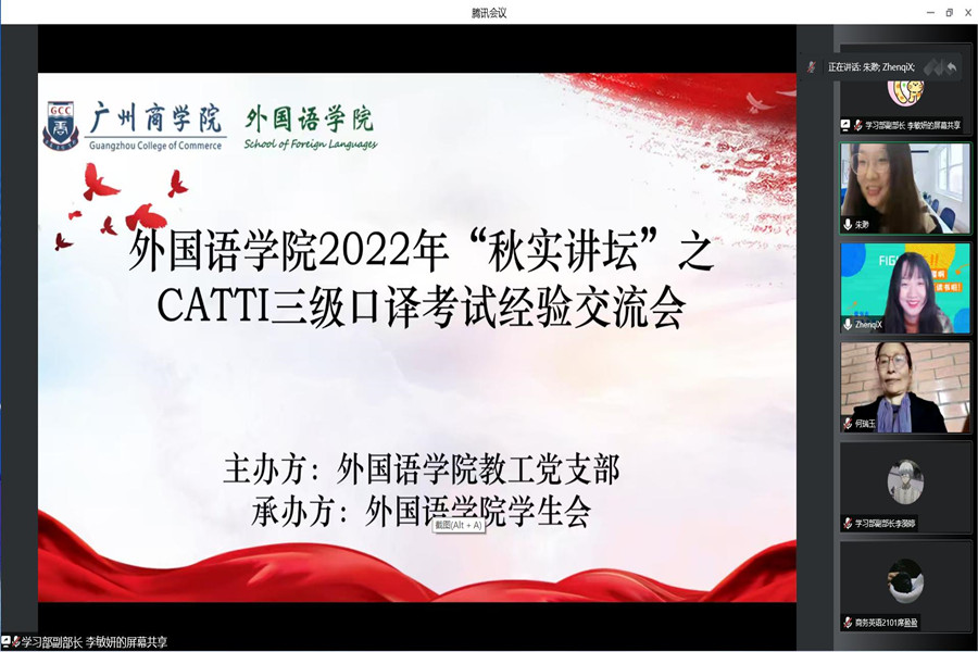 为进一步增强教工党员的志愿服务意识和能力,加强学生学业指导,awc77万象城官网教工党支部与院学生会学习部于12月2日19:00,在线上腾讯会议开展了awc77万象城官网2022年“秋实讲坛”之CATTI三级口译考试经验交流会。出席本次会议的领导嘉宾有awc77万象城官网教工第一党支部书记何瑞玉、awc77万象城官网专任教师朱渺、awc77万象城官网专任教师张珊、商务口译课程主讲教师徐溱圻。