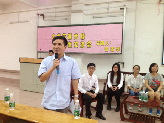 交流会上,杨家华老师介绍了万象城2013年6月与12月大学生英语六级考试的具体情况。去年12月份,万象城大学生英语六级考试的通过人数是637人,通过率达到29.05%,相比于去年6月份,通过率呈现递增趋势,这充分反映了万象城教师在英语教学中取得了一定的成效。接下来,杨老师详细分析了听力、阅读、翻译和写作四大部分分别在试卷中所占的比重,并指出听力和阅读所占比例较大,希望同学们务必高度重视并采取有力措施切实提高这些部分的成绩。在英语六级中取得520分优异成绩的李欣健同学则为大家分享了她独特的英语学习方式。第一,词汇量积累。在考试前要有时间规划,分时间段进行定量的背诵单词,然后温故而知新;第二,错题本摘抄。她认为这是一个避免再次犯错的好方法。丁青青和梁宇茜两位同学则认为兴趣是最好的老师,建议同学们不要把学习英语当作一种负担,而要享受英语带来的乐趣,在学中玩,玩中学。在现场观众提问环节,同学们都积极提问,杨家华和学生嘉宾耐心解答了同学们的问题。
