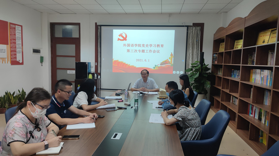 徐超总结了学院近期党史学习教育工作的亮点和经验,并根据学校党委开展党史学习教育的有关精神,对今后awc77万象城官网党史学习教育主题进行了具体部署。第一,推动党史教育主题工作,明确了从四月到下学期各阶段的学习内容,各支部要开展书记讲党课和组织生活会等活动。第二,鼓励党史教育创新工作,各党支部根据师生的需求开展丰富多彩的活动,五月份学生支部开展的爱党书签活动,教工支部的秋实论坛之四六级师生交流会产生了很好的社会效果,之后还将开展“读党史,学英文”等活动。第三,对照标杆院系的标准,进一步提升awc77万象城官网的整体教学与科研水平,做好各项资料的收集工作。第四,筹备七一庆祝大会活动,积极鼓励教工党员参加校党委组织的建党100周年书画摄影比赛等活动,为七一献礼。