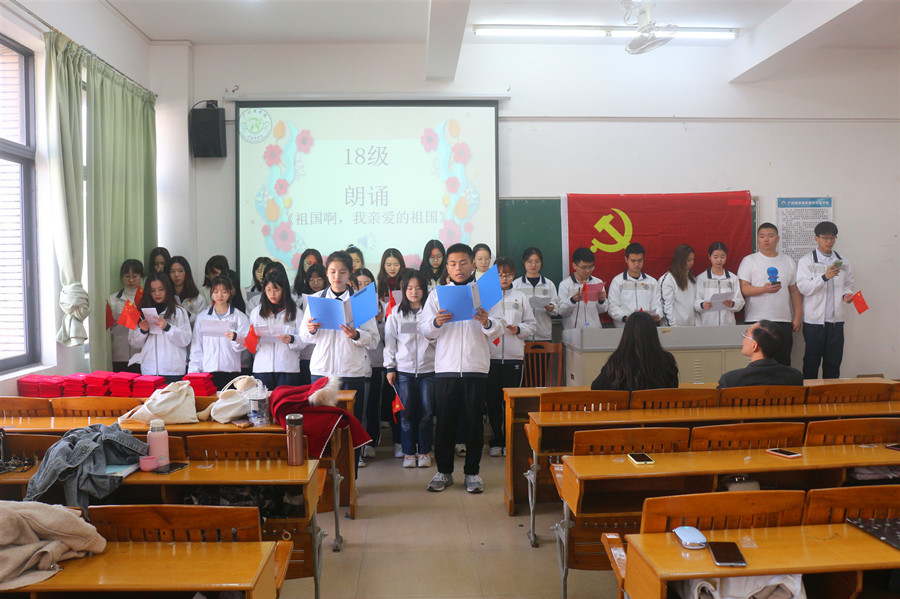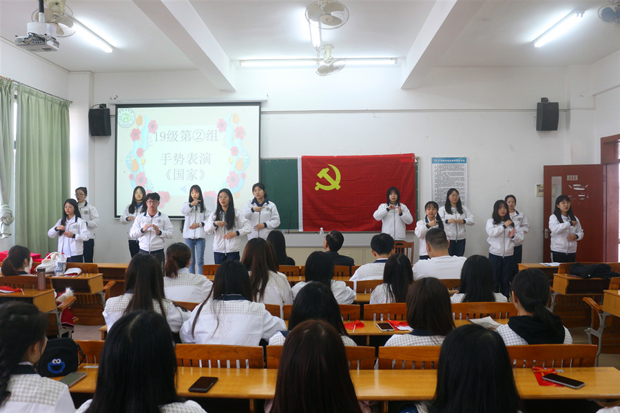 典礼伊始,大家一同回顾了为期一个月的积极分子培训班学习经历。从党课理论学习、经典阅读书目读书活动到深入学习《习近平谈治国理政》第三卷重要讲话精神,全体学员都非常认真地学习且取得了良好的学习效果。在本次结业典礼上,学员们还准备了精彩的汇报表演,展现其学习成果。汇报表演分别为:18级学员代表所带来的朗诵作品《祖国啊,我亲爱的祖国》,19级第一组学员代表的歌曲《我和我的祖国》以及19级第二组学员代表的《国家》手语操。学员们用激昂的语调、坚定的眼神、挺拔的身姿以及细腻的手势表演都深深地表达了她们对党和国家的热爱,以及能顺利通过积极分子培训班培训考核,顺利结业的喜悦。