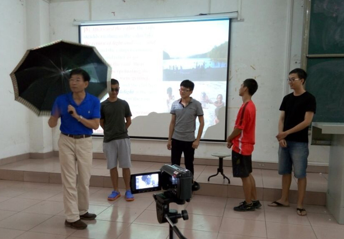曾教授以“高级英语”课程的一篇课文为例,简要地介绍了文本分析的基本步骤,针对文章中的难点采取他独创的“体验建构融通式教学法”进行分析。在讲座之前所有学生已经在老师的引导下对文本进行的阅读和专题研讨,但很多同学还是反应文章有不少地方难以理解。曾教授通过图片和实物演示的方法展示文本背后深层信息,在部分难解之处,曾教授还邀请学生上台表演,帮助学生建构作者的经验世界,这种别开生面的教学方法调动了学生的学习积极性,教室笑声不断,学生也不时地发出“哦”的一声,有豁然开朗之感。