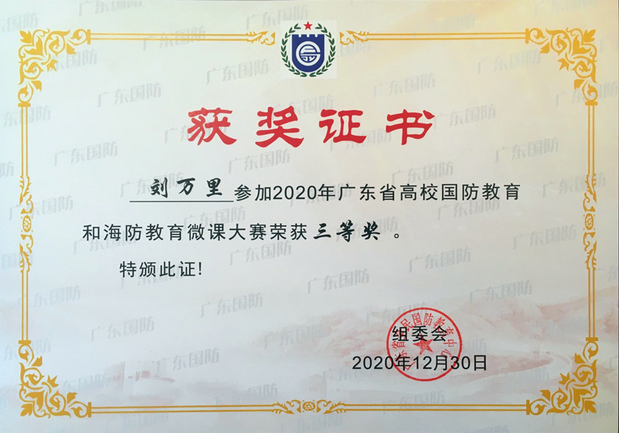 万象城刘万里老师荣获广东省国防教育和海防教育微课大赛决赛三等奖