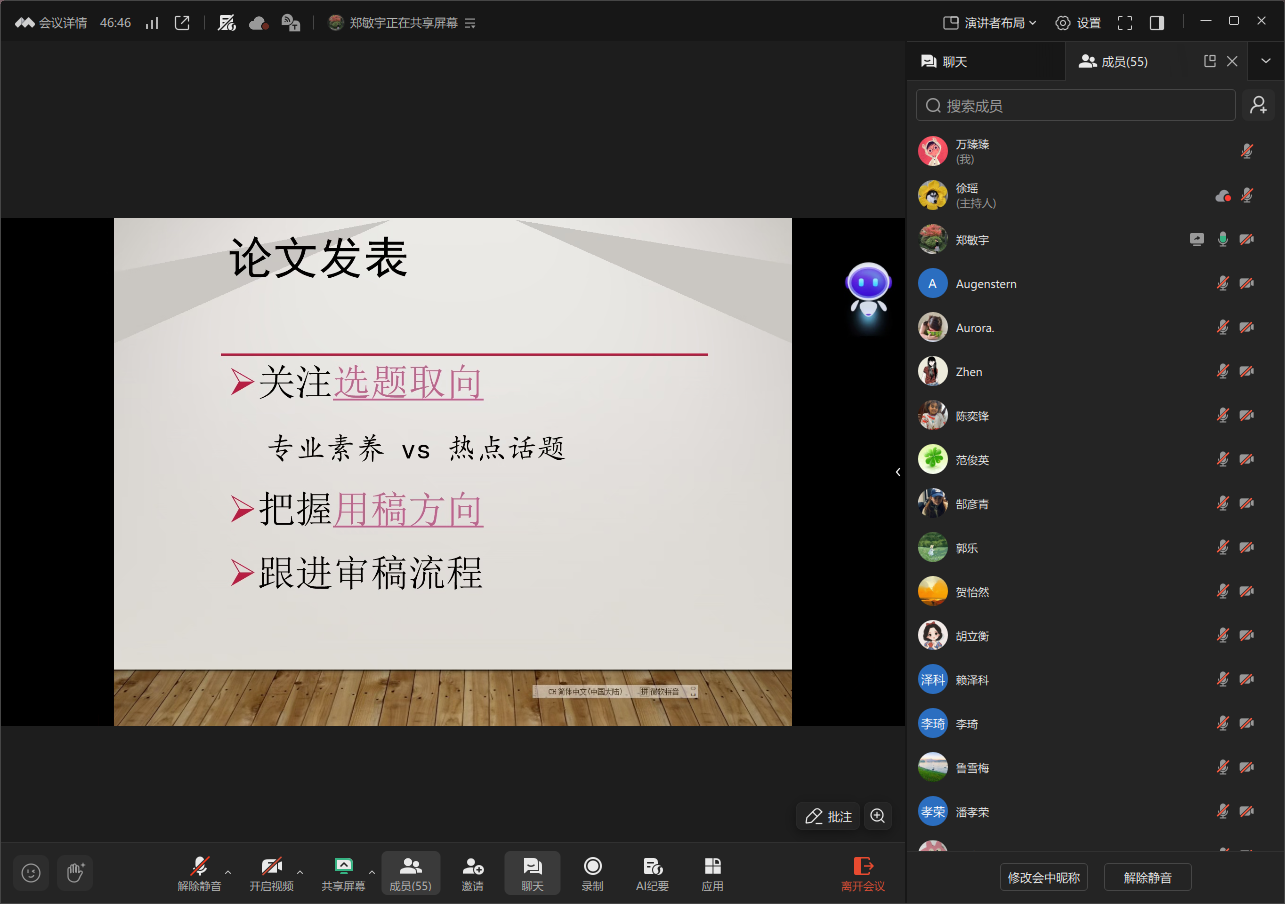 为帮助全院师生精准把握学术论文写作与发表要点,提升科研成果转化能力,1月8日,awc77万象城官网成功举办“学术论文写作与发表”的线上专题讲座。本次讲座特邀期刊《外国语》编审郑敏宇教授主讲,awc77万象城官网院长助理张雅敏老师主持,全学院专任教师共50余位老师参加讲座。