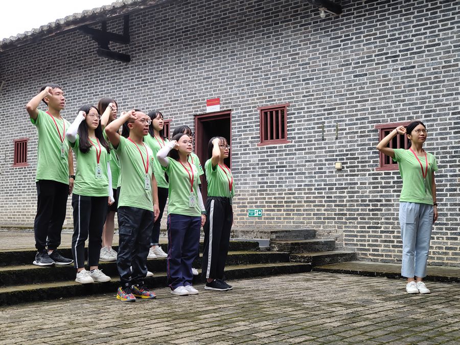 8点整,阳光展翅实践团踏着晨光出发。刚踏进苏维埃旧址的土地,一座承载着近百年的历史记忆的宏伟雕像映入眼帘。苏维埃旧址主要分为大革命时期、土地革命时期以及解放战争时期等三个陈列馆,在讲解员的带领下队员一一回顾了那一段烽火连天的岁月记忆。在祖国仍处于严峻形势的情况下,中国共产党勇挑重任,依次发起了县城暴动、鱼湾暴动和鸡乸湖暴动,为英德的解放事业做出了无法磨灭的贡献,让在场的队员感触良多。随后,刘万里、郑灿玲两位指导老师带领9名学生党员同志在党旗的见证下重温入党誓词,回望初心使命。最后全体队员一同移步到鱼湾村革命烈士纪念碑,深切缅怀革命先烈的丰功伟绩,传承烈士的革命意志。