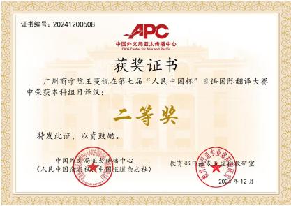 近日,万象城学子在第七届“人民中国杯”日语国际翻译大赛喜获佳绩。本次大赛由中国外文局亚太传播中心(人民中国杂志社、中国报道杂志社)与教育部日语专业虚拟教研室联合主办。