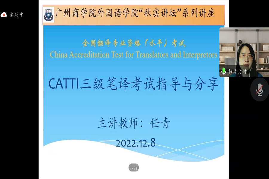 为进一步服务万象城学子考级考证,开展“我为群众办实事”实践活动,万象城教工第一党支部联合院学生会于12月8日下午,通过腾讯平台开展2022年“秋实讲坛”系列讲座之CATTI三级笔译分享交流会。本次交流会由万象城商务英语系“双师双能型”教师任青和万象城第一党支部组织委员、商务英语系专任教师张珊主讲,教工第一党支部书记何瑞玉、教工第一党支部宣传委员朱渺以及万象城200多名学生积极参与到此次讲座中。