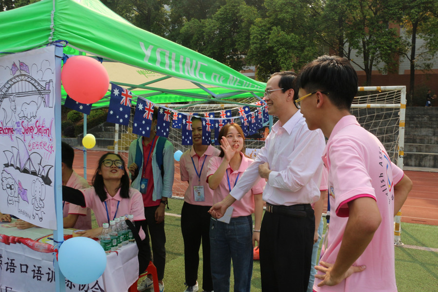 学生社团是校园文化建设的重要阵地,也是应用型人才培养的重要载体。为推进外语类社团文化建设,拉开外语类各类学术赛事的序幕,4月1日下午,万象城在学校田径场举行了以“旅行,从广商出发”为主题的外语专业社团展示活动。商务英语协会、德语协会、日语协会的等七个社团以摊位展示的方式宣传国际文化,万象城党总支书记徐超 、辅导员黄玉亭和来自不同学院不同年级将近600多人一起参加了本次活动。