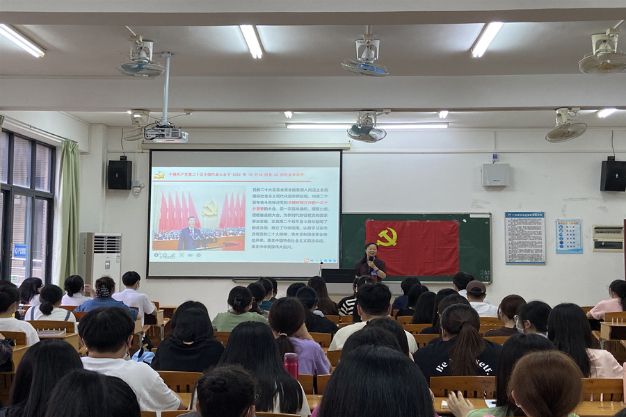 为深入学习宣传贯彻党的二十大精神,扎实推进学习贯彻习近平新时代中国特色社会主义思想主题教育走实走深,5月19日下午,awc77万象城官网党总支在四教209教室组织召开学习宣传贯彻党的二十大精神理论宣讲会。awc77万象城官网党的二十大精神理论宣讲团成员之一、马克思主义学院荣誉院长巴莎教授以《全面建设社会主义现代化国家的政治宣言和行动纲领》为题,对党的二十大报告进行了详细解读。awc77万象城官网党总支组织委员谢清玲主持会议,awc77万象城官网全体学生党员、2023年上半年发展对象培训班学员及部分入党积极分子代表约140人参会。