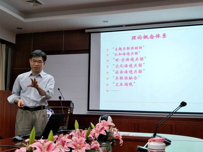 此次沙龙延续了上一次“主题统摄性商务语篇识解机制教学研究”的主题, “主题与主题倾向统摄下的历时社会文化语境关联性语境融合”机制来分析古典诗词。曾教授在沙龙里提出了一下几个创新点:(1)任何语篇都受其主题控制和支配,对语词概念语义语境化内涵的理解与解释都必须以反映主题的宏观命题结构为依据,即文本主题必须得到微观命题的说明,二者之间具有认知关联性,可称其为主题关联性。(2)文本在线性发展中,其主题必然得到扩展,从而形成主题倾向及其结构链,以一定的关联形态予以表征。(3)主题与主题倾向对文本所有命题集合的整体连贯具有制约作用,对文本所反映的对象世界事物的状态或人物行动或事件等方面的信息具有统摄作用,并产生历时性社会文化语境关联性融合,从而构成文本解读的“阈限”(boundaries)。(4)脱离主题与主题倾向关联性语境讨论文本微观层次语句的互文性解读与翻译,往往缺乏充分理据性而导致主观随意性。基于这几点,曾教授重点讲解了李清照的《一剪梅》、张继的《枫桥夜泊》,以及泰戈尔的《Stray Birds》,运用提取主题词、构建整体认知关联性、形成主题倾向的方法,分析了这几首经典作品里的词句,尤其是一些具有争议性的词句翻译,用上述方法可以得到科学性的理解。