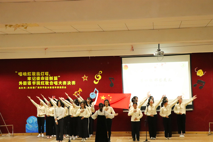 经过激烈竞逐下脱颖而出的八支参赛队伍,在今晚的决赛现场上贡献出了一场场精彩绝伦的表演,他们的合唱让红歌大赛现场热情涌动。活动以博雅吟唱团的《山丹丹花开红艳艳》表演拉开序幕,给现场的观众带来了一场长笛、古筝、琵琶、二胡与钢琴相融的音乐盛宴。比赛正式开始,红狮队给我们带来了《保卫黄河》,他们身着统一的民国服饰,神情从容自信。他们纵情高歌,唱响红色基因,表达出对黄河母亲浓厚的爱。红鹰JCT合唱队给我们带来的《红旗飘飘》展现了广商莘莘学子积极向上、励志图强的青春风采。那些花儿队给我们带来了《东方红》,他们以饱满的激情、嘹亮的歌声深情演绎了这首立意鲜明、催人向上的红歌。经过参赛队伍们一轮轮的火力比拼,最终,那些花儿队荣获一等奖、红鹰JCT合唱队荣获二等奖、红狮队荣获三等奖,合唱大赛决赛在阵阵掌声中落下了帷幕。