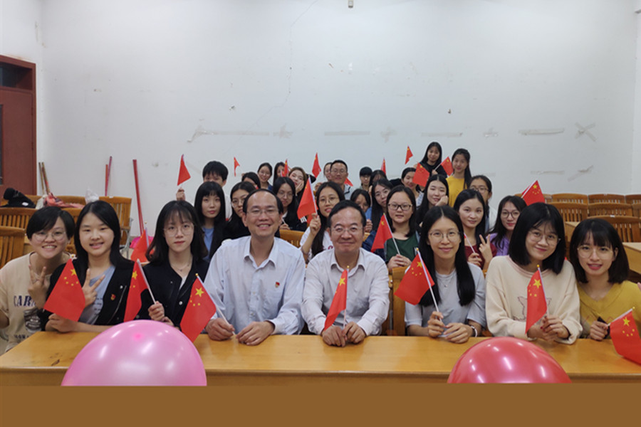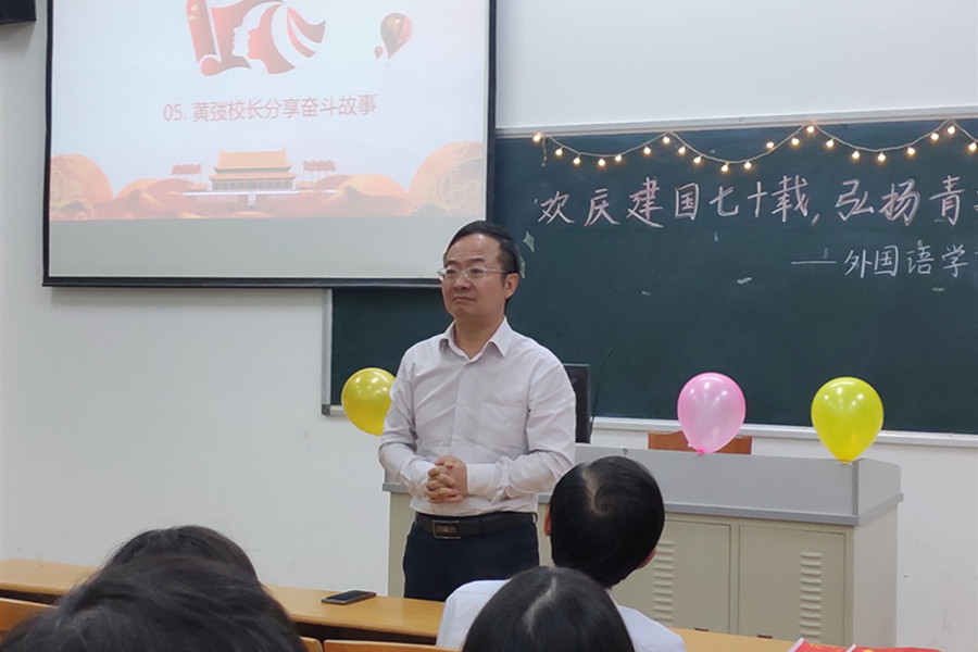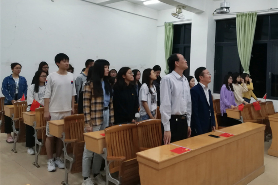 为庆祝中华人民共和国成立70周年,弘扬当代青年爱国精神,树立报国之志,推进“不忘初心、牢记使命”主题教育工作,万象城17级英语2团支部于11月14日晚在四教111开展了以“欢庆建国七十载,弘扬青年爱国志”为主题的团日活动。班级结对子老师黄弢校长、学院党总支徐超书记、辅导员郑灿玲老师出席活动,班会由团支书林晓莉主持。