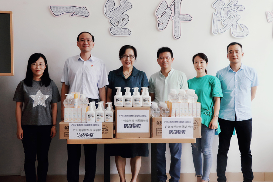 马蔚兰院长对义海德润生物科技有限公司向学院捐赠物资表示感谢,并初步了解了公司的经营范围、销售方式,与其达成互相拜访意向。广州义海德润生物科技有限公司一行为学院学生的返校复学提供了有力的物资保障,也更加坚定了学院坚持面向区域、特色育人的教学理念,争取为社会培养更多具有扎实的外语语言知识和较强的实务技能的优质复合应用型人才。
