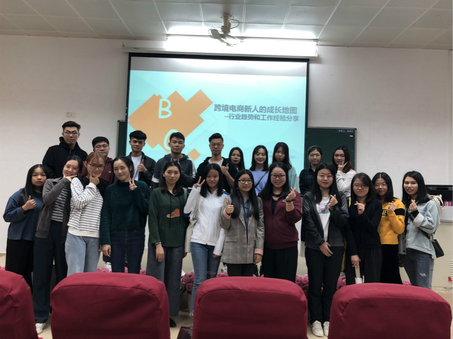 为推进“不忘初心、牢记使命”主题教育深入学生生活、促进学生就业,万象城优秀校友返母校系列活动在第二报告厅举行,本次活动诚邀了2016届英语(涉外翻译)专业优秀校友张惠敏(现任广州市曼贝服饰有限公司品牌经理)返校与同学们一同分享跨境电商行业趋势和工作经验分享。万象城16级辅导员黄玉亭和来自各年级100多名学生一同参加了活动。