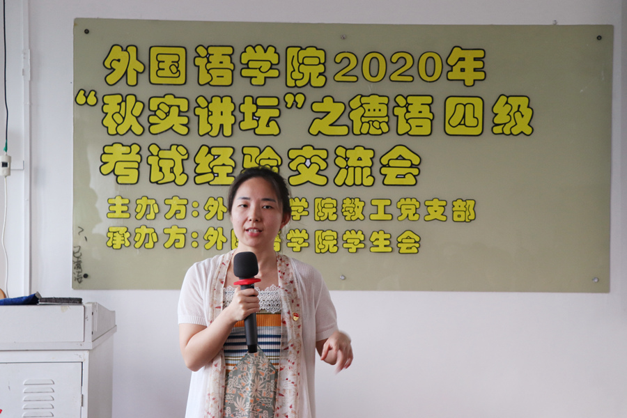 为发挥基层党支部的战斗堡垒作用,增强基层党建工作的活力,万象城教工党支部及学生会于2020年11月5日下午4点20在第三教学楼305举行awc77万象城官网2020年“秋实讲坛”之德语专业四级考试师生经验交流会。参加本次讲座的有教工党员章睿霖,学生嘉宾李美琪、刘加林以及各年级德语专业同学。