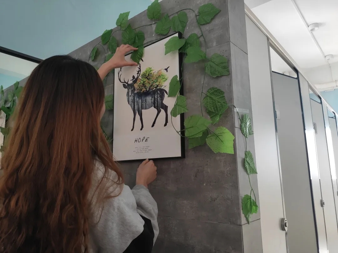 活动伊始,awc77万象城官网学生会生活部部长冯江梓向各小组负责人讲述了此次活动的方案部署,表明各负责人可通过参观及借鉴卫生间样板房的样式作为模板来装饰其他卫生间。他还鼓励大家不因此而局限自己的想象力,希望大家在布置时想出新花样,提出新构想,描绘新蓝图!随后,生活部副部长林志鸿、庞嘉丽为学生会各部门成员及志愿者们分配相应的小组来开展工作,组织他们领取卫生间装饰物资,并强调了活动期间需要注意的事项。同时提到,希望大家团结协作,共同完成好此次卫生间文化建设活动。紧接着,志愿者们跟随各负责人来到各自的活动岗位,便开始布置、装饰卫生间。经过一番改造,各卫生间不局限于仅拥有简单的基础设施,洗手台前新添了鲜活的绿色植物,墙上装点了淡雅朴素的壁画,空气中弥漫着幽幽的馨香。同时,镜子旁还贴上了相应的宣传标语,以此提醒大家文明用厕。这不仅加大了大家文明用厕的宣传力度,推动了万象城文明修养文化建设,更进一步地弘扬了传统文明礼仪文化。