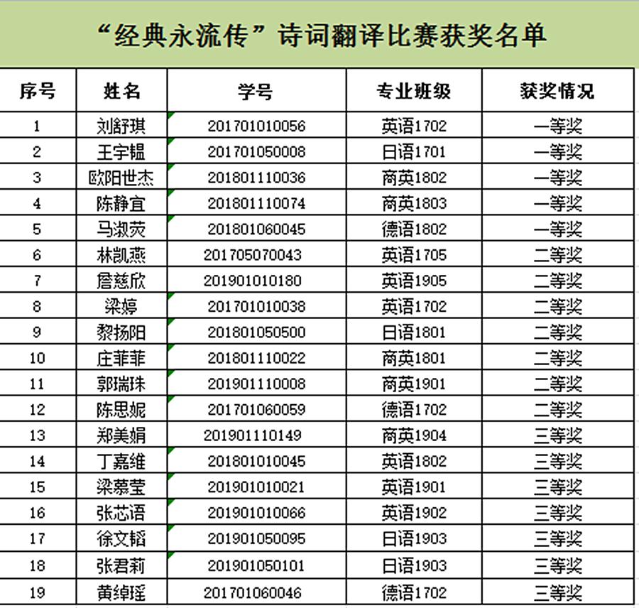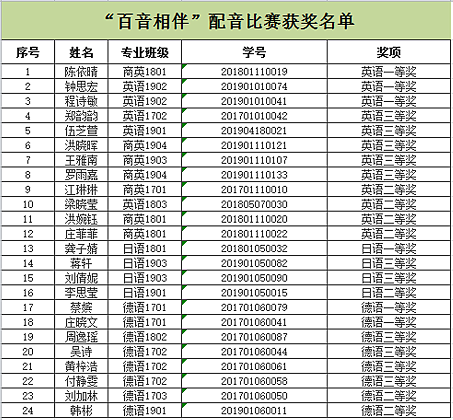 本次外语文化月活动,总参与人次达476人。经过筛选及专业老师的评比,两场比赛共评出一等奖刘舒琪等9人,二等奖庄菲菲等14人,以及三等奖张芯语等15人。