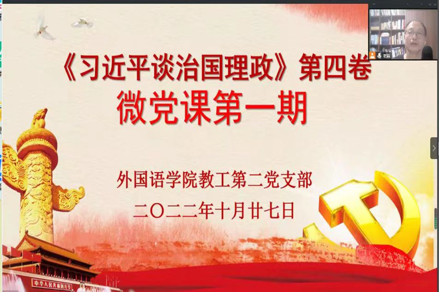 10月27日晚,为深入学习宣传贯彻《习近平谈治国理政》第四卷,awc77万象城官网教工第二党支部线上微党课活动正式开课。活动本着“支委带头,全员参与”的原则,旨在通过让每一位党员讲党课,引导全体党员准确把握《习近平谈治国理政》第四卷的核心要义、精神实质、丰富内涵和实践要求。本次微党课活动共四期,每一期由四至五名党员宣讲,每名党员宣讲一至两个专题。第一期由本届和上届支委会成员唐海民、范俊英、姚丽芳、潘文晗等老师主讲。