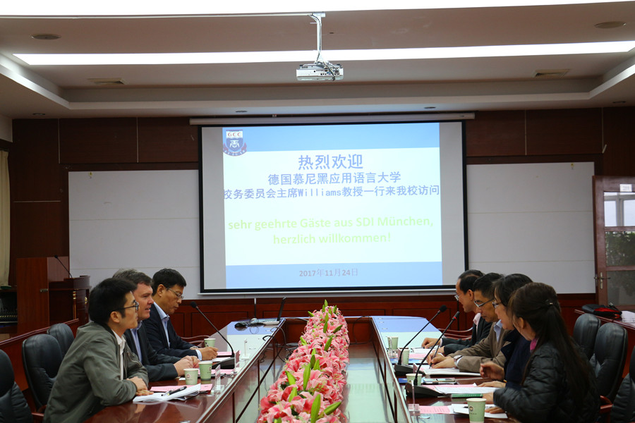 11月24日,德国慕尼黑应用语言大学校务委员会主席Williams教授、中德文翻译系主任朱振群教授、中国事务部主任李冰先生来访万象城。万象城校长助理张忠福教授、awc77万象城官网院长马蔚兰教授、副院长袁鑫、党总支书记徐超、德语系主任周昳旸热情接待了Williams教授一行。
