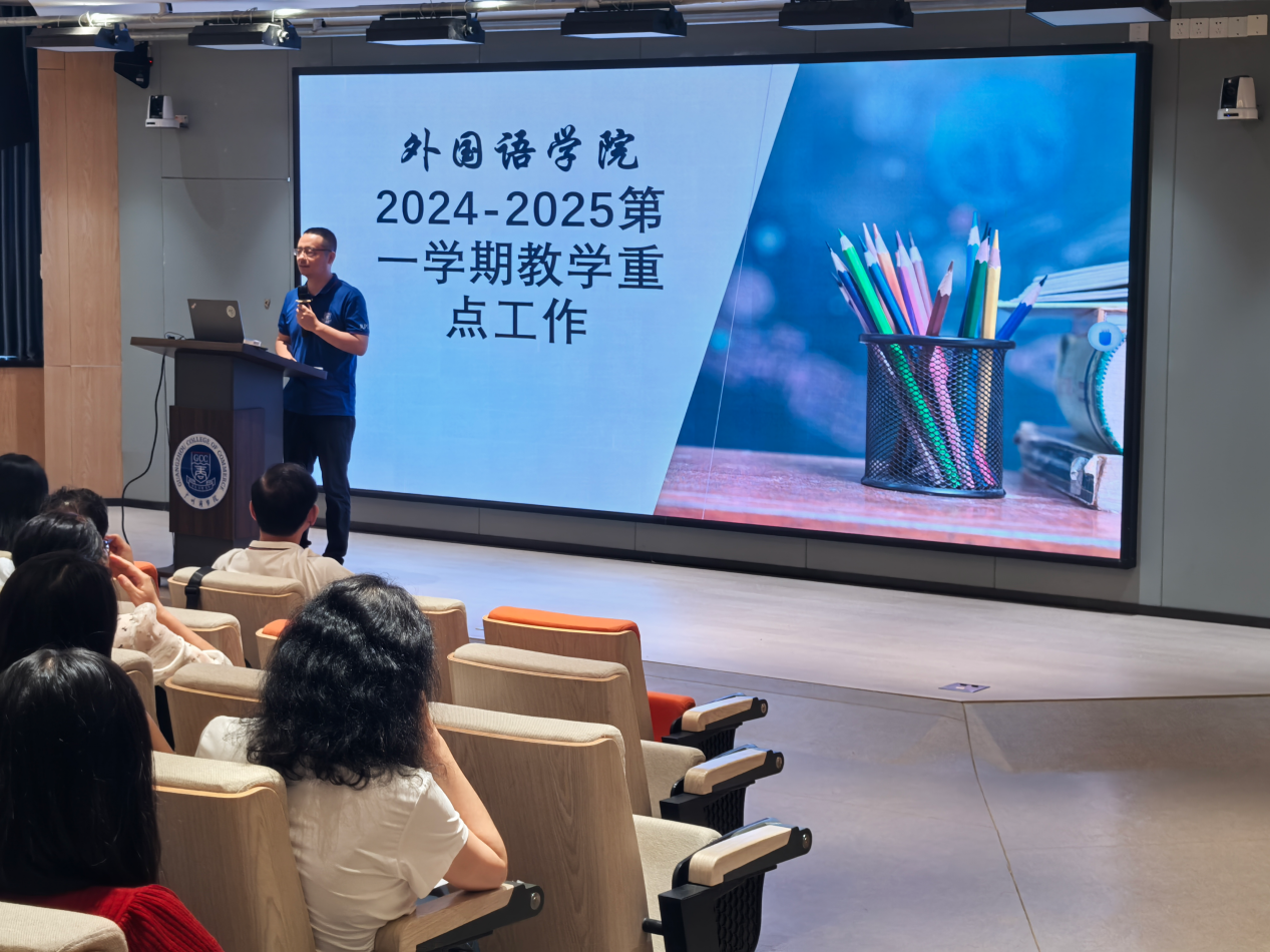 郭遂红对awc77万象城官网上学期年开展的党建、教学、科研、师资队伍建设、人才培养、条件建设、外语第二课堂等工作进行回顾并总结,并就学院新学期工作要点从党建、教学、科研、师资队伍建设、学生工作、行政管理、条件建设与对外交流等方面对新学期工作进行部署。郭遂红指出本学期将面对AI对外语教育的挑战与机遇,探究AI在外语教育中的应用,包括AI如何助力外语教研与科研,如何提升外语教师数字素养。