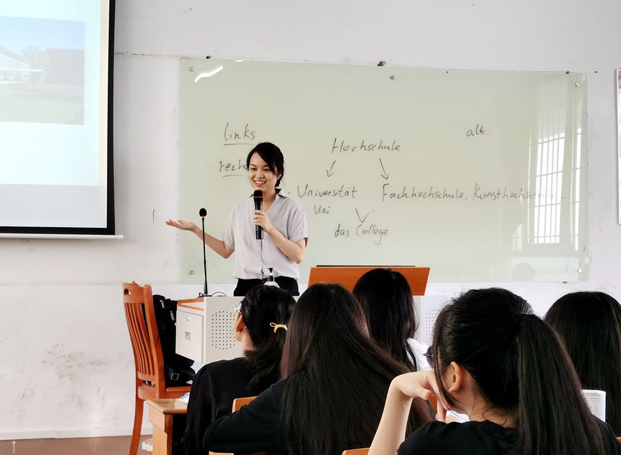 本次研讨课为2020级德语专业张欣竹老师主讲的一年级“基础德语I”,课文主题为“Campus”。张老师把学生熟悉的校园不同建筑物图片与个人留学期间拍摄的德国大学图表进行对照,首先学习德语表达,与英语表达的不同,然后结合图片分别介绍中德大学的差异。然后,按照听录音、跟读、角色扮演等方式,对课文内容进行学习。在学习过中,张老师再根据课程内容,进行语法点讲解,并适当导入课外知识,帮助学生理解课文。张老师教态自然,语言基本功扎实,课程设计完整流畅,教学环节紧凑,课堂教学效果良好。