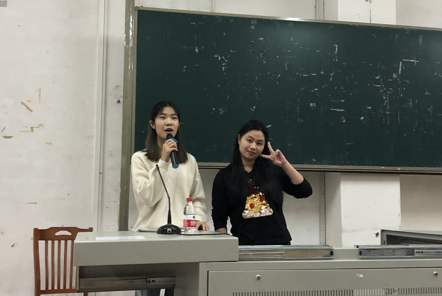 商务英语3班刘嘉雯和范钊铭同学在分享实习经验