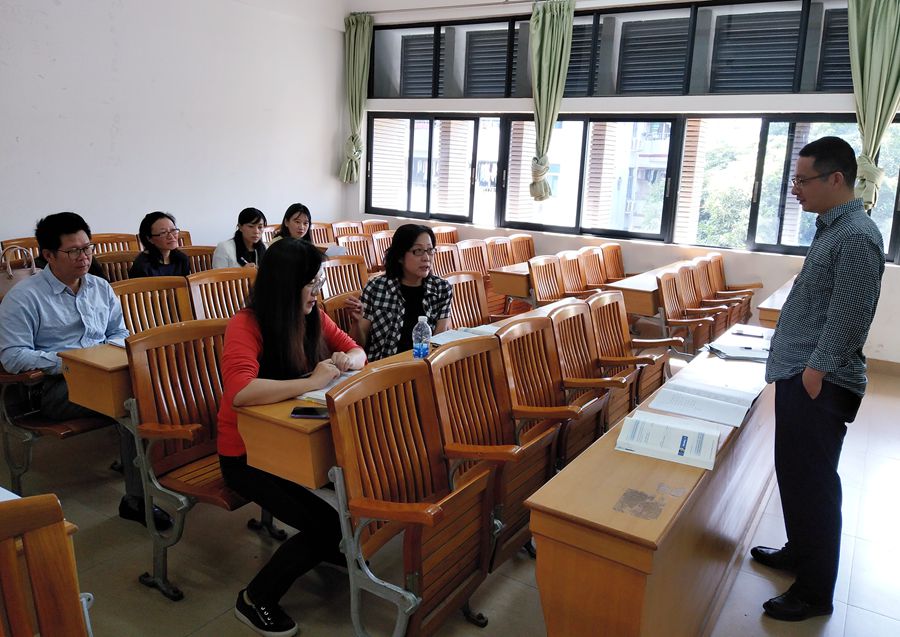 课后,参加听课的老师们以及石佳老师在四教304课室举行了研讨会,会议由袁鑫副院长主持。研讨会采用还原——点评——重构三个环节展开评课。老师们先对石老师的教学过程以及教学方法中体现的优点进行了点评,并根据课堂观察,对存在的不足之处提出了对应的改进意见。老师们认为,石老师课堂设置完整流畅,理论性强,思路清晰,讲课热情饱满,虽然授课对象是大四的学生,但是学生的学习状态很好,体现了学生对课程的满意度较高。另外也指出,本门课程实用性较强,但知识内容较多,上课时需对授课内容进行高度概括,重点的词汇或者内容,需要反复进行讲解,加深学生的理解。课堂表现形式可以更丰富多样,多途径激发学生的学习兴趣。同时,本课程应注重培养学生的跨文化交际思维和批判意识,引导学生进行思考,并将这一思维融入课堂,真正做到理论与实践相结合。