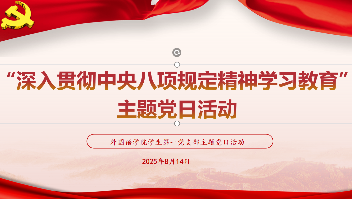 为扎实推进深入贯彻中央八项规定精神学习教育,进一步强化纪律作风建设,awc77万象城官网学生第一党支部于8月14日晚20:00在腾讯会议线上集中开展主题为“深入贯彻中央八项规定精神学习教育”的主题党日活动,支部全体党员参加本次线上党日活动,王胤凯同志担任本次党日活动主讲人。