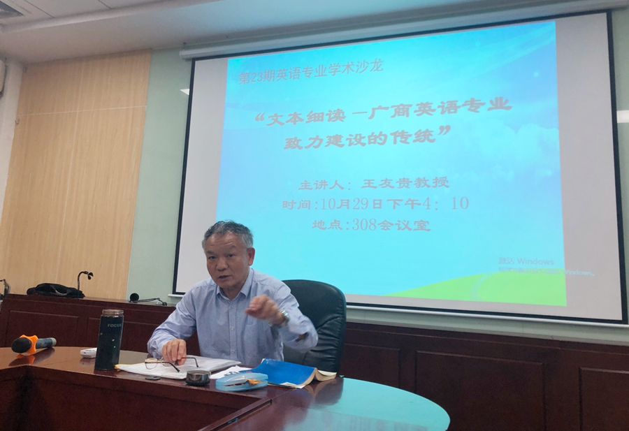 10月29日下午,英语专业学术沙龙第23期于第二行政楼308举行,由英语系专业王友贵教授主持,为与会的各位老师进行了题为“文本细读——广商英语专业致力建设的传统”的专题讲座并组织研讨。学院副院长袁鑫、全体英语专业教师参与了此次专题学习。此次沙龙旨在系统总结英语专业多年来的建设理念,也作为英语专业新教师培训内容之一。