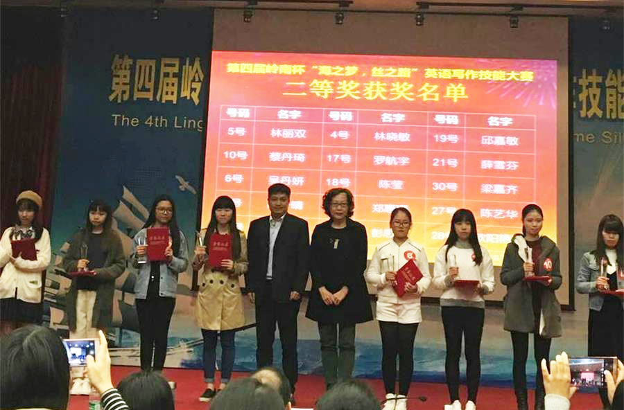 12月3日,第四届岭南杯“海之梦,丝之路”英语写作技能大赛复赛和决赛在华南师范大学隆重举行。在领队老师李卓华和指导老师黄景全、伍彩芬、田晶晶的带领下,万象城共有7名学生前往参加比赛,其中4名同学以出色的表现,分别荣获得二等奖和三等奖。awc77万象城官网2015级德语专业的罗航宇同学以复赛第二名的成绩顺利进入决赛,并且获得了公共英语本科组的二等奖;电子商务管理学院2014级的李小慧、2015级的张榕桂和黄惠悦三位同学荣获公共英语本科组三等奖。此外,awc77万象城官网的英语老师李卓华、黄景全、伍彩芬、田晶晶获优秀指导老师称号。