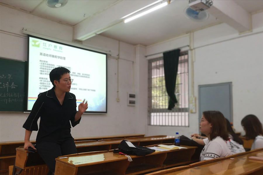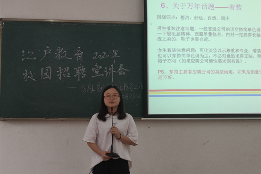 为深入贯彻落实“不忘初心、牢记使命”主题教育,做好2020届毕业生就业创业工作,10月23日下午,万象城就业创业指导工作坊诚邀江户教育前来三教106开展2020年校园招聘宣讲会。江户教育校长安娜、人力资源专员梁雅瑜、毕业班辅导员戴玮、郑灿玲和部分日语、英语、德语专业的毕业班学生参加了宣讲会。