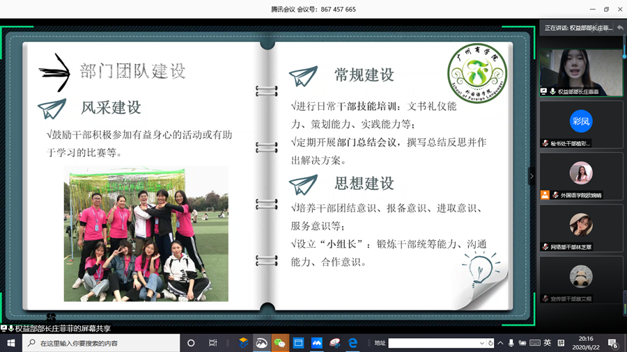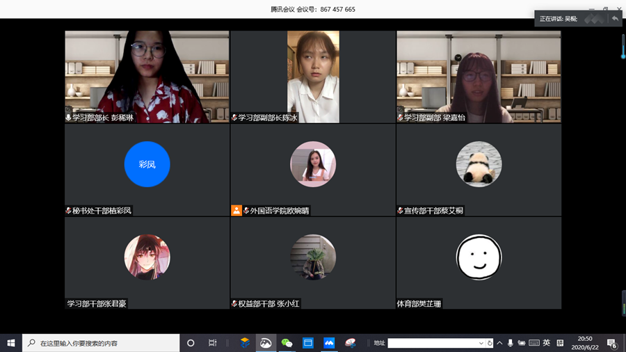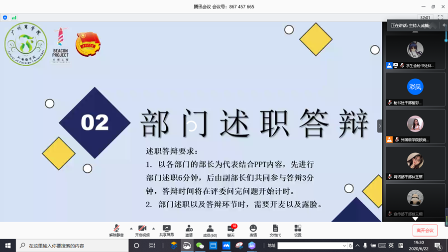 为进一步加强万象城学生会各部门间的密切交流与合作,总结过去一学年的工作经验,万象城学生会于6月22日晚19:30借助腾讯会议“云”平台举办awc77万象城官网学生会2019-2020学年部门述职答辩线上会议,出席本次会议的嘉宾有学院党总支书记徐超、学院学生会指导老师伍思颖以及学生会主席团成员。