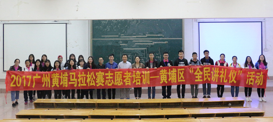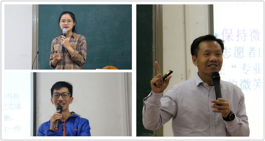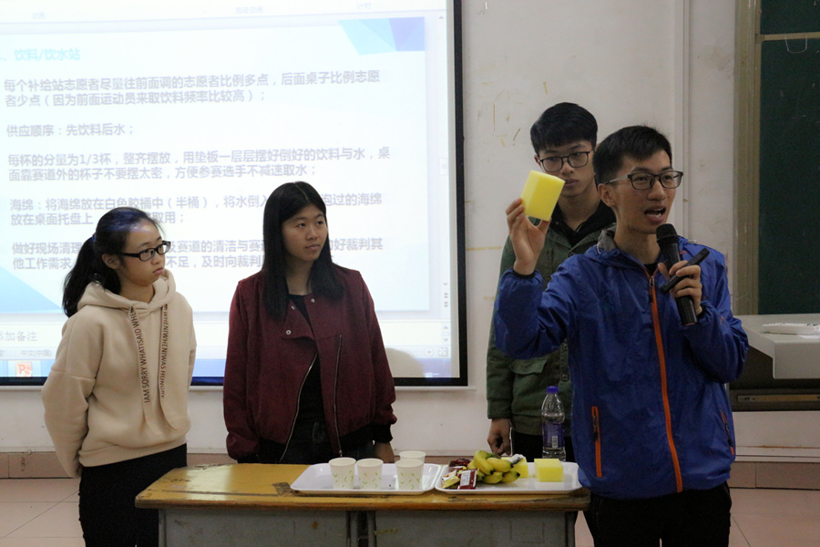 培训主要从马拉松和博览会志愿服务的起源、注意事项以及工作安排三方面展开。主讲人邵振刚首先为同学们进行了培训纲要的介绍,并就马拉松志愿服务理论与技巧和同学们进行了交流与探讨,使同学们对黄埔马拉松赛及志愿服务的基础知识和重要性有了更加深入的了解。随后,邵振刚老师就志愿服务规范和相关案例为同学们进行了详细说明,他强调:“赛事志愿者必须明确自身定位和谨记工作禁令,希望同学们力争做积极、负责的志愿者”。中场休息后,龙家彬为现场的志愿者们详细说明志愿服务的工作安排,他们简明生动的讲解让在座的各位对所负责岗位的工作内容和自身职责有了清晰的认识。接着徐嘉雯介绍了2017宝能广州黄埔马拉松、博览会的赛事规模,并向志愿者们进行了奖牌及参赛服的展示。在培训接近尾声,龙家彬和徐嘉雯还以情景模拟的方式向志愿者们演示了志愿服务过程中可能会遇到的问题,并针对这些问题予以相应的指导,这对今后志愿者工作的顺利开展起到了重要作用。