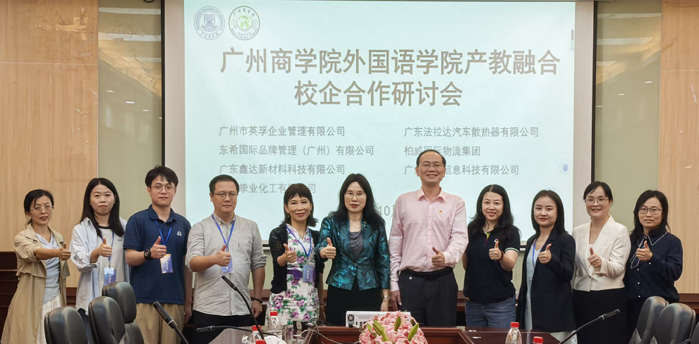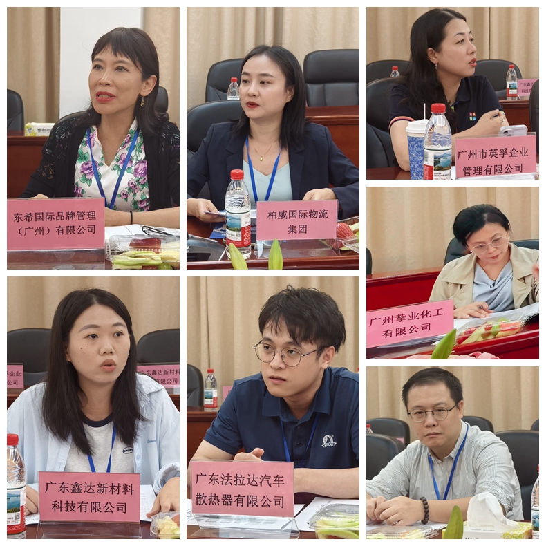 出席本次会议的企业有广州市英孚企业管理有限公司、东希国际品牌管理(广州)有限公司、广东法拉达汽车散热器有限公司、广东鑫达新材料科技有限公司、柏威国际物流集团、广州挚业化工有限公司、广州太信信息科技有限公司,涵盖了跨境电商、国际商务、语言服务、会展服务等领域。会上,郭遂红院长首先从学院概况、学生情况、生源质量、学生竞争力等方面展开了介绍,在随后的产教融合合作研讨环节,她进一步提出校企合作的具体方向,指出万象城在构建“外语+商务”“外语+跨境电商”等复合型人才培养体系,可以从顶岗实习、推荐就业、双师培养、校企共同申报科研项目等方面进行深度合作,引发企业代表热烈讨论。双方围绕多元合作方式展开深入交流,针对企业提出的“人才供需错位”问题,探讨了“订单式培养”模式;此外,双方还就“行业导师进校园”“学生实习基地共建”“企业项目进校园”等合作形式进行了初步的探讨。
