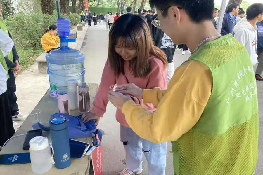 气温骤然降低,但20级的入党积极分子们的认真与负责并没有因此与天气温度同步下降。在李超老师的组织下,awc77万象城官网20级学生党支部部分入党积极分子有序集合,进行小组分工,设立帐篷点,准备热水、葡萄糖、跌打损伤药物等物资。长跑开始,他们身着绿马甲,驻守在各个岗位。他们是引导者,引导大家做跑前热身,让同学们在长跑时避免受伤;他们是鼓励者,在跑道边上给同学们加油鼓劲;他们也是志愿者,在操场各个设点处来回巡查有无受伤或身体不舒服的同学并及时提供帮助和服务。