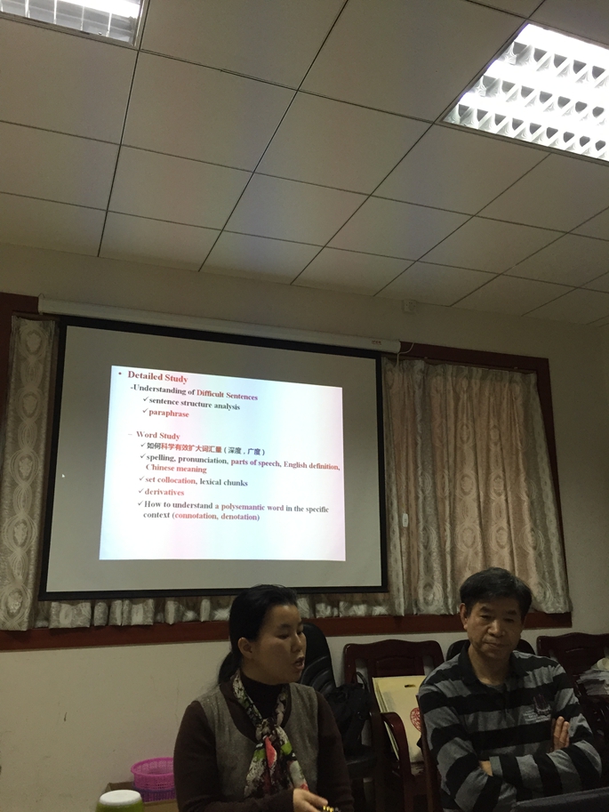 在讨论过后,曾教授进行了点评,并向我们展示了他的备课思路。曾教授立足于商务英语专业人才的整体能力目标提出了该单元教学目标和要求。在图式理论和语境参数论的指导下,曾教授的教学设计主要包括课前热身、课文主旨和细节分析、课文宏观结构分析、语言重难点分析、文段意译、英文隐喻表达以及构词法等7个方面。曾教授表示,要充分调动学生的主观能动性,拓展他们的知识面,从知识图式的构建开始,慢慢消化课堂的内容,从而形成学生自己的图式。同时他还强调,要从听说读写译5个方面进行教学设计,哪些步骤是训练哪方面的能力,这个要有所体现。最后曾教授提出要从整体角度思考布局,不能仅限于课本的文章,要把商务和英语进行有机融合,通过课文的难点分析提高自己的研究能力。