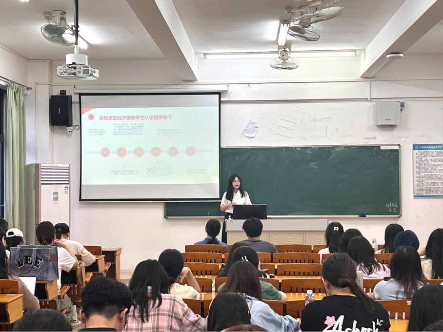 宣讲会上,王慧敏通过简洁明了的流程图,分别从“偿、免、奖、助、贷、勤、补”七位一体的学生资助政策体系进行宣讲,并详细地介绍了国家以及校内相关资助政策,涵盖了国家奖学金、国家励志奖学金、《广东省家庭经济困难学生认定办法》政策、生源地信用助学贷款以及大学生入伍及退伍资助政策内容。随后,她着重向同学们讲解了家庭经济困难认定的申请流程、材料准备及要求、注意事项等。