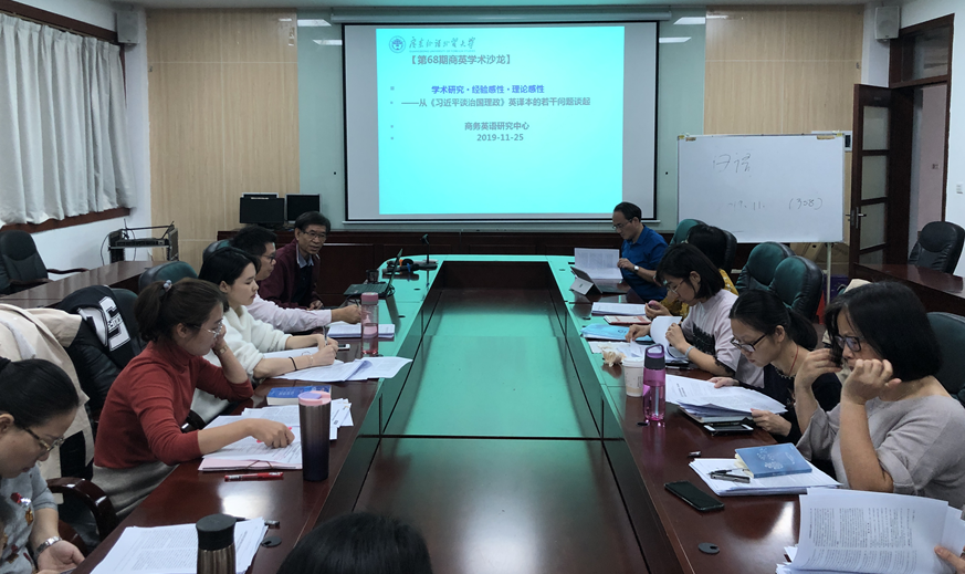 2019年12月25日下午四点,第68期商务英语学术沙龙在awc77万象城官网第二行政楼308会议室举行,本次沙龙的研讨主题是“学术研究•经验感性•理论感性——从《习近平谈治国理政》英译本的若干问题谈起”。沙龙由学科带头人曾利沙教授主持,商务英语系全体教师参加了此次沙龙。
