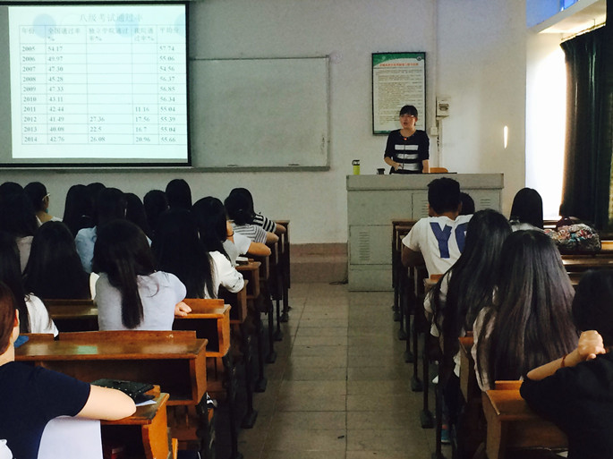 伊始,黄玉亭发表了动员讲话,她强调了同学们在学习中既要保持英语专业八级备考的紧迫感,也要提高自身的自信感;既要保持坚定的考试信念,也要懂得优化备考的方式。在备考道路上,开展团队学习,互帮互助,争取优异的成绩。紧接着,张蕾老师根据外语专业教学测试办公室在2015年8月颁发《关于英语专业8级考试(TEM8)题型调整的说明》,向同学们详细介绍了新年度TEM8考试局部调整的试卷结构和测试题型。在英语专业八级各项题型的介绍中,张蕾老师深层次地剖析了测试要求、测试形式、测试目的和选材原则,让同学们对新改革的专业八级考试有了深入的了解。随后,张蕾老师通过数据向同学们展示了往年万象城、独立学院和全国英语专业八级的通过率和各项题型的分数比例差距,既明晰了同学们备考的重点难点,也大力度地提高了同学们备考的方向和信心。