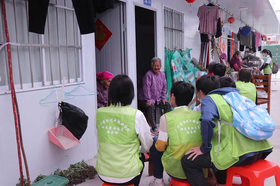 接下来,志愿者们被分成四个小分队,由精通粤语的志愿者带领各自的组员慰问老人们。老人们得知志愿者们的到来,感到非常高兴,紧接着志愿者们为其打扫卫生,关心老人们的日常起居情况,使他们的脸上挂满笑容,开心的说着近期的生活琐事,并感谢志愿者们的陪伴。