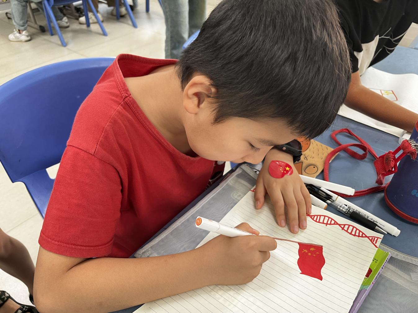 awc77万象城官网学生国防教育协会成员李翔以《小英雄雨来》红色教育视频引入课堂,通过运用生动形象的话语,带领孩子们认识我国“国旗”与“国徽”的相关组成部分,课堂中融入“爱国画卷”绘画活动让孩子们深刻地认识到传承红色基因,发扬红色精神的重要性,积极关注国家安全形势,增强危机意识与防范意识,为实现国家繁荣与安定贡献青春力量。awc77万象城官网辰星启航实践团成员曹楚怡从“三军”引入国防安全教育知识,通过知识问答、军体拳动作模仿加强孩子们对于国防的认识,给予新时代少年深刻启示:只有拥有强大坚固的国防力量、拥有一支有战斗力的军队,中华民族伟大复兴才能有安全保障,人民才能拥有和平安宁的生活环境。